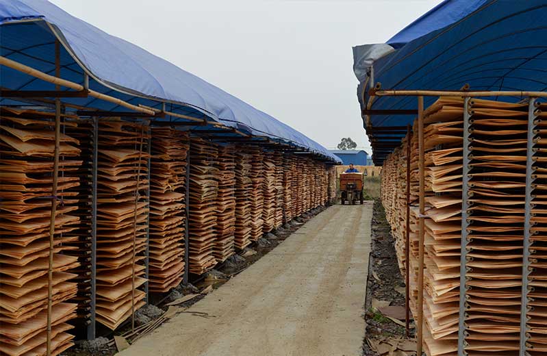 說到旋切廠,不得不提到的是怪獸木業(yè)曬板場。300畝的曬板場滿滿的都是芯板,怪獸木業(yè)的曬板場不僅曬旋切廠刨出來的板材,更多的是各個供應(yīng)商提供的濕板材。每天的板材曬干收,收完再曬,重復(fù)使用無間斷。工人們每天早晚都要巡場,巡場不只為了檢查板是否曬干,更重要的是在巡查中一遍遍地挑出那些不合格的二級、三級板,保證怪獸木業(yè)模板原料的高純正性。
