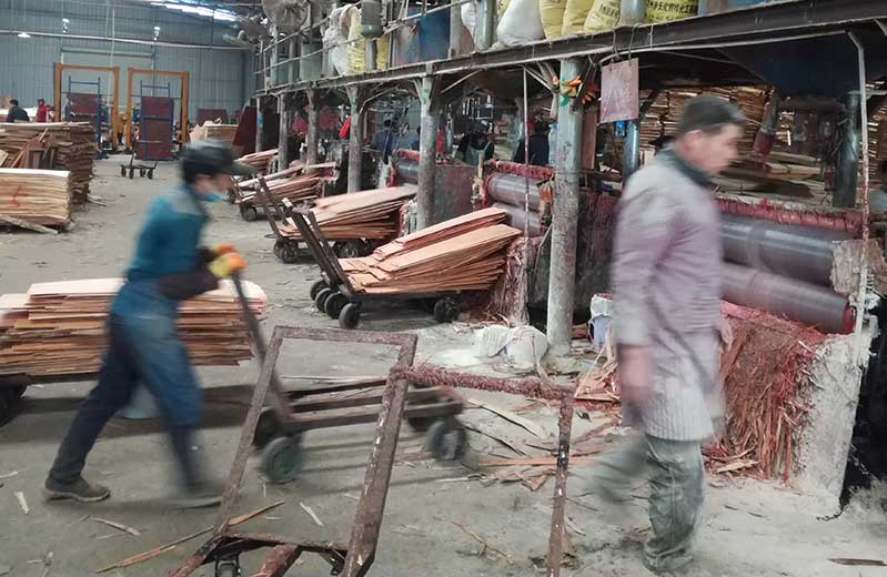 1:選擇**原木材料,原木旋切成片,工長測試剛剛旋切下來的單板厚度。將原木按照一定的層厚度進行水平面的切割旋切,根據模板的尺寸大小才裁切成比例相同的木層。