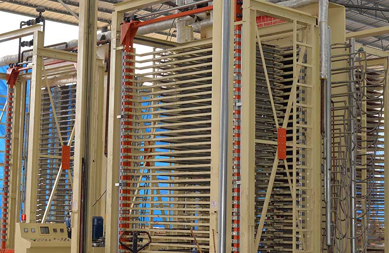 6:熱壓成型處理:經過涂膠鋪設好的模板層,通過熱壓工藝進行壓平。傳統的加熱時采用了鍋爐水傳到熱進行加熱,現代化設備室采用了電加熱,壓平后,可以增加建筑模板的密實度,成型比較規則,提高了模板的使用質量。采用先預壓再熱壓的工藝,大程度降低坯板錯位的幾率,再施以合理的壓力和溫度熱壓,保證了每一張建筑模板均有好的膠合強度和硬度。